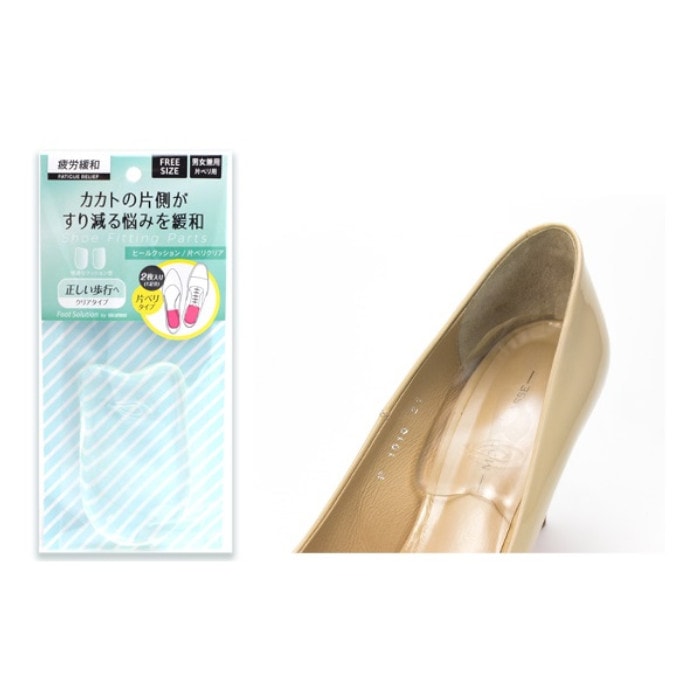 かかとの片側がすり減る悩みを緩和する透明ジェルパッドです。